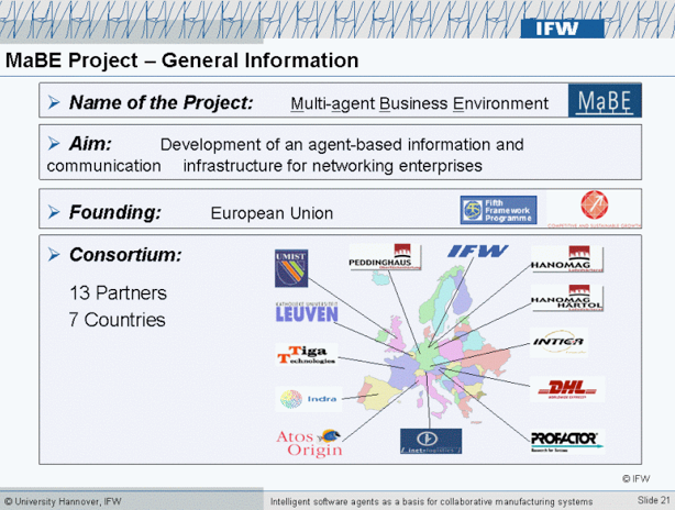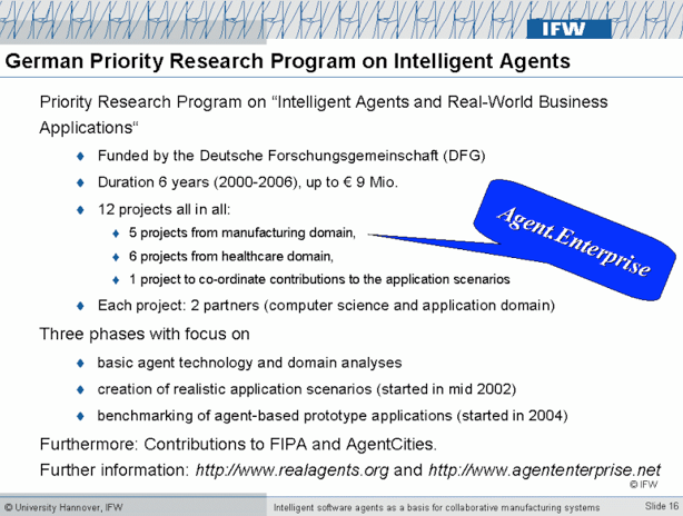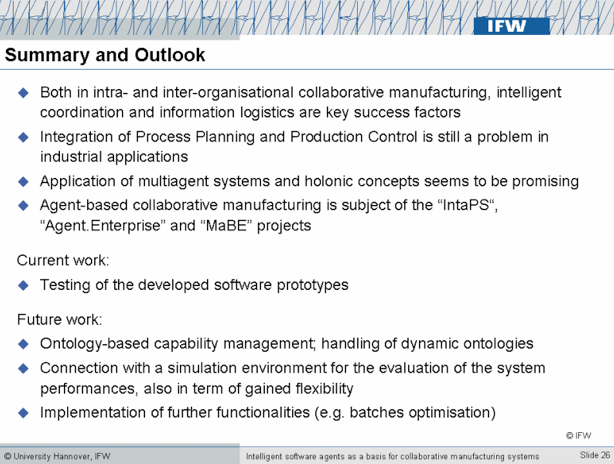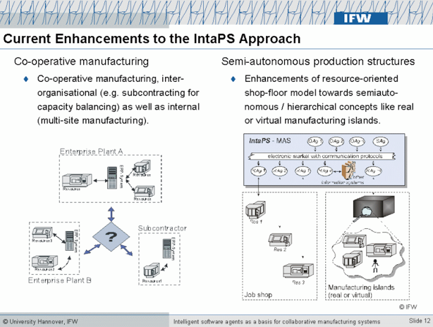 Since most of today’s industrial products are characterized by high complexity, sophisticated manufacturing processes and numerous customer-specific variants, modern manufacturing is in need of flexible and adaptive concepts for intelligent production. Thus, next-generation manufacturing systems have to take advantage of innovative information techniques in order to fulfil these demands. Furthermore, numerous products are too complex to be manufactured by a single company in an economical as well as efficient way today. Thus, next-generation manufacturing systems have to be distributed as well as collaborative, which will increase the demands concerning appropriate information technology even more. In this context, application of intelligent software agents is one of the most promising approaches for implementation of collaborative manufacturing systems. This paper will illustrate this approach by means of results of some selected research projects.