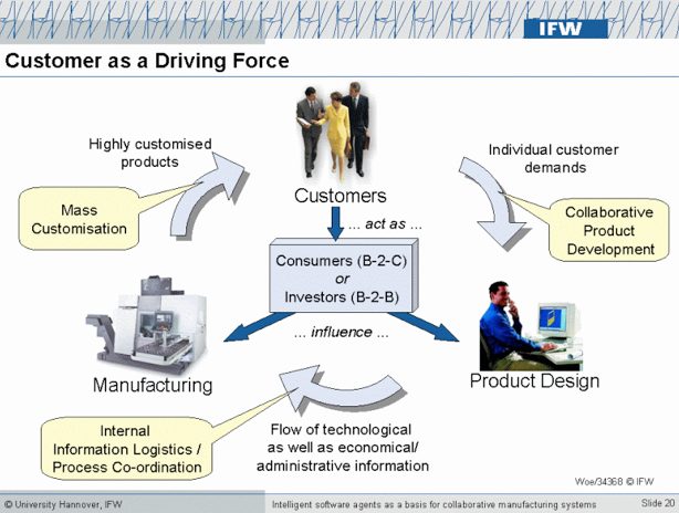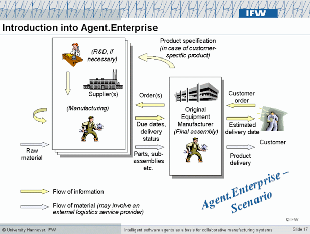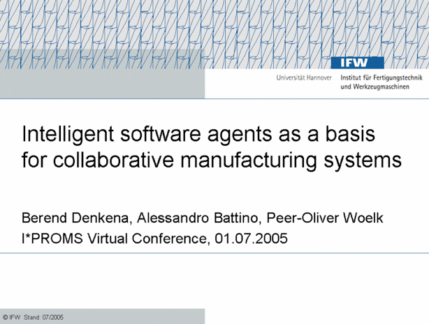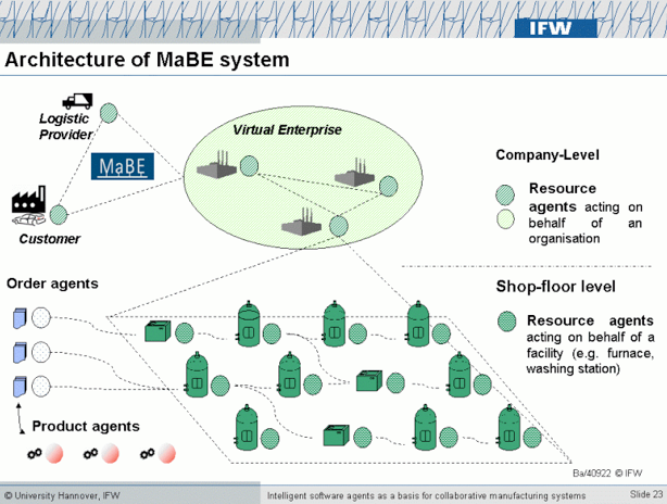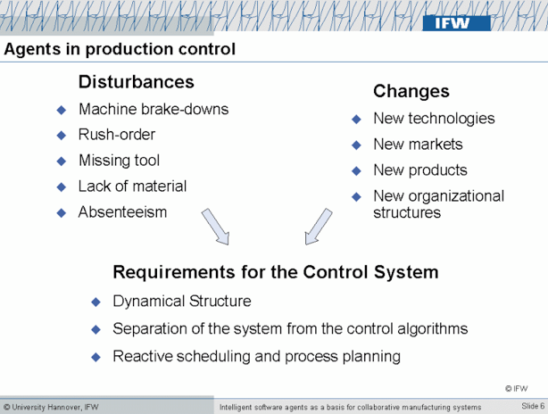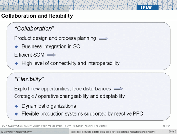 Since most of today’s industrial products are characterized by high complexity, sophisticated manufacturing processes and numerous customer-specific variants, modern manufacturing is in need of flexible and adaptive concepts for intelligent production. Thus, next-generation manufacturing systems have to take advantage of innovative information techniques in order to fulfil these demands. Furthermore, numerous products are too complex to be manufactured by a single company in an economical as well as efficient way today. Thus, next-generation manufacturing systems have to be distributed as well as collaborative, which will increase the demands concerning appropriate information technology even more. In this context, application of intelligent software agents is one of the most promising approaches for implementation of collaborative manufacturing systems. This paper will illustrate this approach by means of results of some selected research projects.